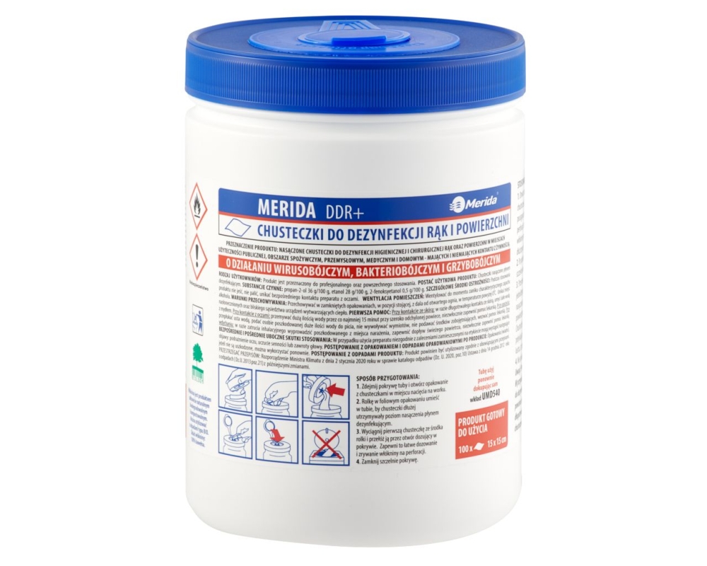 Zaawansowana formuła dezynfekcyjna: Chusteczki MERIDA DDR+ zawierają mieszaninę trzech substancji czynnych: etanolu, izopropanolu i fenoksyetanolu. Dzięki temu są niezwykle skuteczne w walce z grzybami, bakteriami i wirusami. Produkt posiada pozwolenie na obrót produktem biobójczym nr 3329/TP/2020.